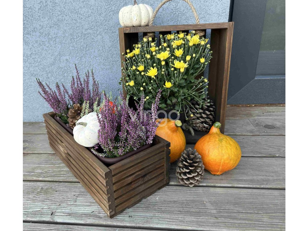- Dřevěný: Na výrobu bylo použito borovicové dřevo, které je velice kvalitní a má velmi dlouhou životnost. Přírodní textura a barva dřeva dodávají truhlíku autenticitu a teplý vzhled.