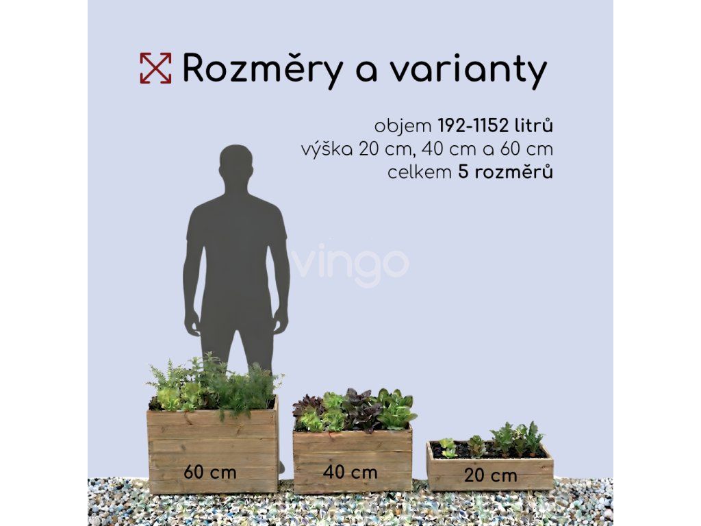 - 120×120×60 cm — 2 990 Kč — čtvercový záhon pro víc druhů naráz. Na 1,4 m² se vejdou třeba jahody, salát a bylinky vedle sebe.