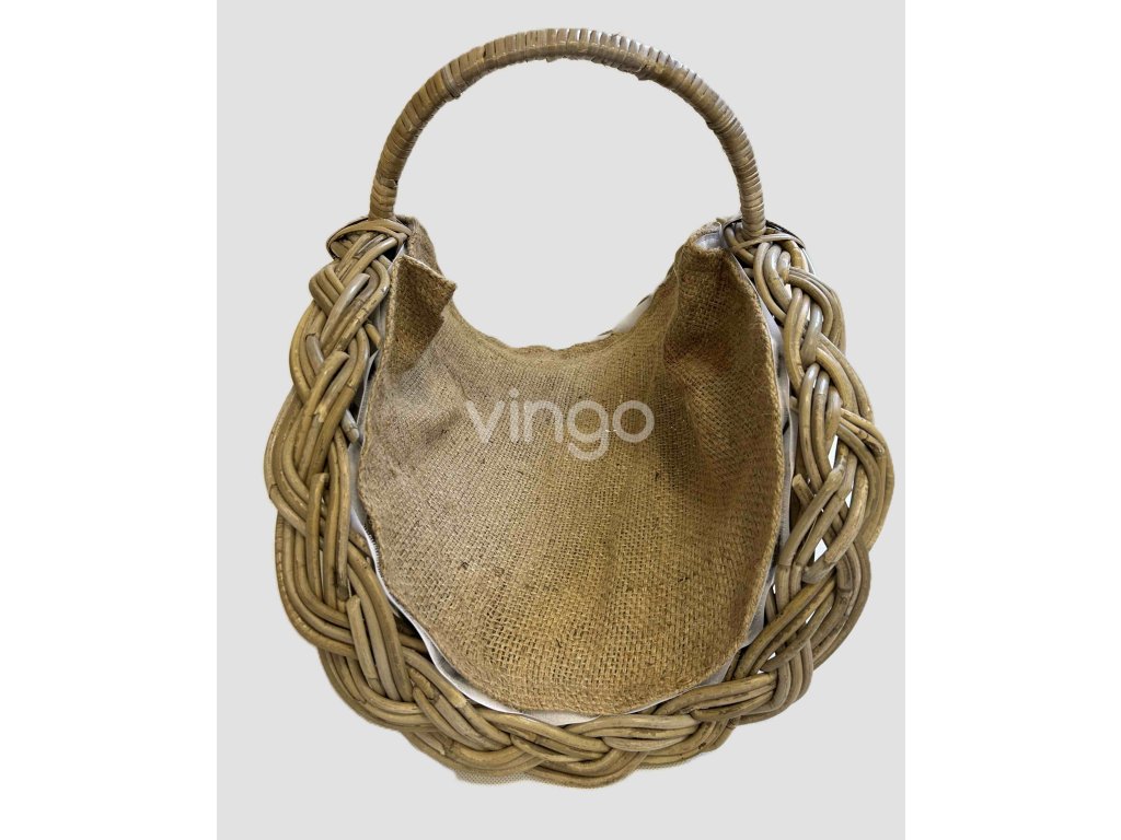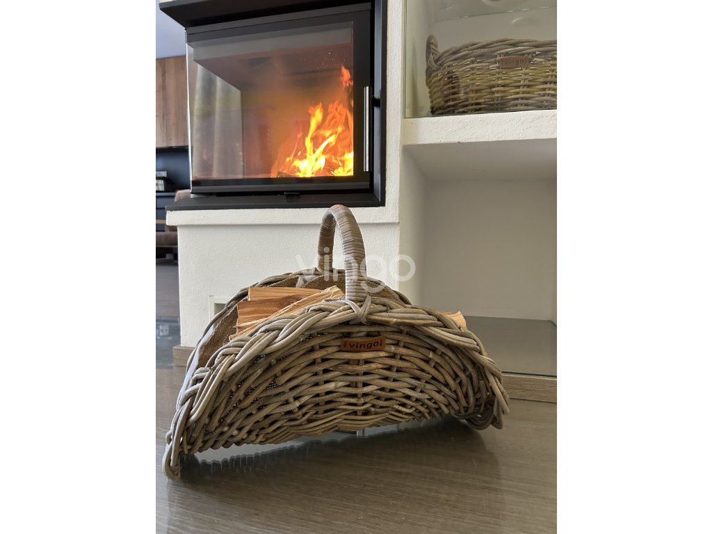 Ratanový koš na krbové dřevo, vějíř s pytlovinou