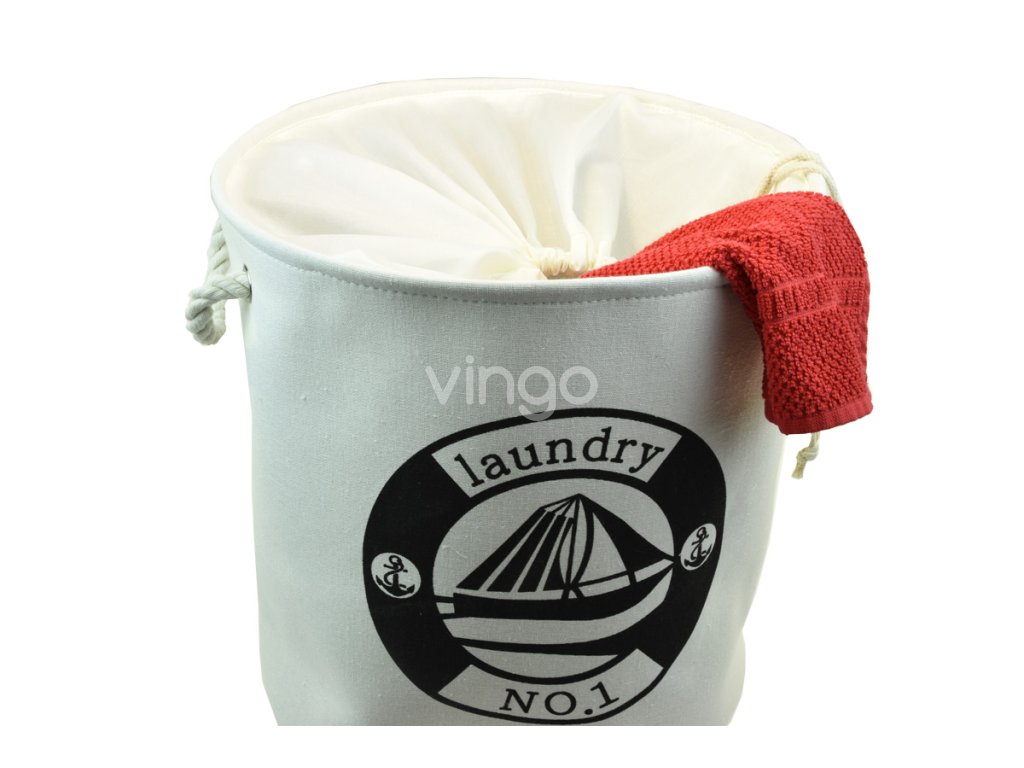 Koš je vyroben ze silné textilie, která drží tvar. Víko je taktéž textilní, neodjimatelné, se stahovacím provázkem uprostřed. Úchyty jsou vyrobeny z bílého provazu.Informace o produktu: